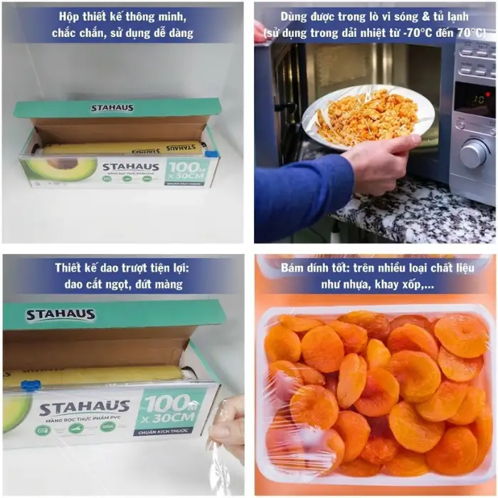 - Chịu nhiệt tốt: Bọc thức ăn bằng màng STAHAUS có thể chịu được nhiệt độ nhất định (phù hợp cho việc quay trong lò vi sóng hoặc bảo quản trong ngăn mát). Lưu ý: không dùng trong lò nướng thông thường hoặc tiếp xúc trực tiếp với nhiệt độ quá cao.